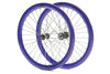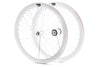 Designed for speed and style in a more compact package, these Pure Fix double-walled aluminum wheelsets are size 650C with a 45mm rim depth, front and rear. Our wheels include name-brand and laser-etched, 120 mm KT Quando hubs. Our rear wheels include flip-flop hubs with a pre-attached 16T fixed cog along with a 16T freewheel cog for single-speed riding. Front and rear wheels feature 32 spokes each and all wheelsets include nylon rim-strips to protect against sharp edges and prevent tube puncture.